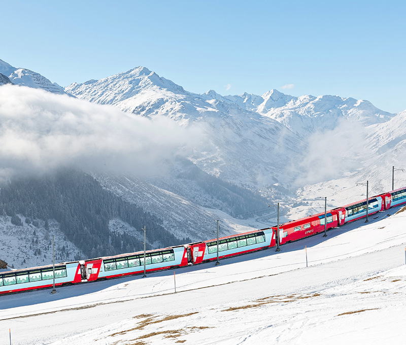 Unisce Zermatt e St. Moritz attraversando 291 ponti e 91 gallerie, con carrozze a vetrata panoramica.